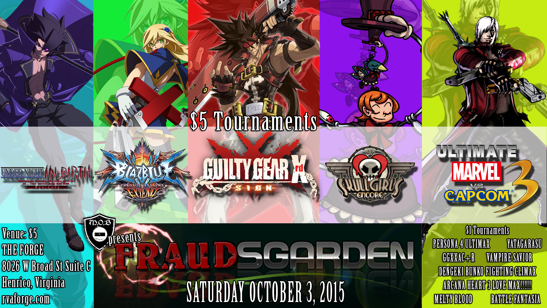 Team MOB presents-FRAUDSGARDEN-OCTOBER 3, SATURDAY2 weeks before CEOtaku!Check flyer for full list of games!!!----------THE FORGE8026 W Broad St Suite CHenrico, Virginia (basically Richmond) VENUE: $5-------------GAMES: All played on PS3 or PC except for Marvel$5 TOURNAMENTS(Double Elim, Top 3 Payout)GGXRD BBCPE UNIELSKULLGIRLSUMVC3 (XBOX360)$1 TOURNAMENTS(Double Elim, Winner Takes All) YATAGARASUPERSONA 4 ULTIMAXGGXXAC+RDENGEKI BUNKO FIGHTING CLIMAXVAMPIRE SAVIOR ARCANA HEART 3 LOVE MAXMELTY BLOODBATTLE FANTASIA----------https://www.facebook.com/events/1469267940042485/More details soon!! If you can provide setups and any game listed, please let us know! FOOD NEARBY: BON CHON, POPEYES, WAWA, MCDONALDS + A MILLION RESTAURANTS ON BROAD ST.
