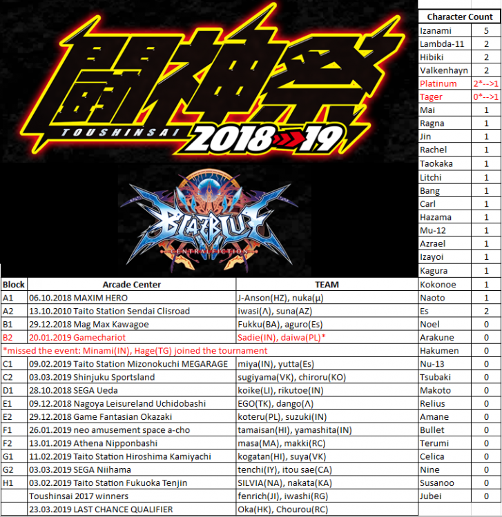 jinbe Posted June 17, 2018 Posted June 17, 2018 BLAZBLUE CENTRAL FICTION - GATEWAY TO BLAZBLUE II info: https://taito.co.jp/arc/gtb2018 Qualifiers Q1 - Taito Station Fukuoka Tenjin 03.06.2018 https://www.youtube.com/watch?v=DUSv4NXI-Po Q2 - MAXIM HERO 03.06.2018 https://www.youtube.com/watch?v=Iy4LF-52GYg Q3 - Taito Station Sendai Clisroad 10.06.2018 https://www.youtube.com/watch?v=YbbLrolXJvo Q4 - Max Plaza Zentsuji 10.06.2018 https://www.youtube.com/watch?v=uyUOYyJawHQ https://www.youtube.com/watch?v=IspY5MCAUWk https://www.youtube.com/watch?v=JYnaLwLVz68 https://www.youtube.com/watch?v=UV0XTr-Gd8Q https://www.youtube.com/watch?v=fkHOteO_7B4 Q5 - Taito Amusement City Koriyama 16.06.2018 Q6 - Amipara Castle 16.06.2018 https://www.youtube.com/watch?v=7kNlW9-3qHw https://www.youtube.com/watch?v=u9FwNKNbAwQ https://www.youtube.com/watch?v=885JJ-oeVQs Q7 - Playspot Big One 2nd 17.06.2018 https://www.youtube.com/watch?v=6gBiJvZZYss Q8 - Phoedra P&D Urban Square Osu 23.06.2018 https://www.youtube.com/watch?v=Be7MyP5zyiI Q9 - Ikebukuro GIGO 24.06.2018 https://www.youtube.com/watch?v=1HphI7Hx9hA Q10 - neo amusement space a-Cho 30.06.2018 https://www.youtube.com/watch?v=zQoFlkMecSU Q11 - Athena Nipponbashi 01.07.2018 https://www.youtube.com/watch?v=5VY0rUxNPck Q12 - Gamechariot 08.07.2018 https://www.youtube.com/watch?v=BaCCbgqK228 https://www.youtube.com/watch?v=Iyrh9aZxpr4 https://www.youtube.com/watch?v=xHqFv1cpjbI https://www.youtube.com/watch?v=EagXuOZmWxk https://www.youtube.com/watch?v=3wOJ8nlmxj4 Q13 - Joyland Sabae 15.07.2018 https://www.youtube.com/watch?v=JIdCsZl-1UQ Q14 - Shinjuku Sportsland 16.07.2018 https://www.youtube.com/watch?v=etOU6LsGwbo Q15 - Central Hachiouji 28.07.2018 http://www.nicovideo.jp/watch/sm33668749 http://www.nicovideo.jp/watch/sm33668925 http://www.nicovideo.jp/watch/sm33669031 Shinjuku Sportsland 18.08.2018 pre GTBII https://www.youtube.com/watch?v=2GUE0XkhgJU Taito Station Mizonokuchi MEGARAGE 19.08.2018 GTBII main event https://www.youtube.com/watch?v=QToELGRw7uw https://www.youtube.com/watch?v=XkPD1k2Fg0w