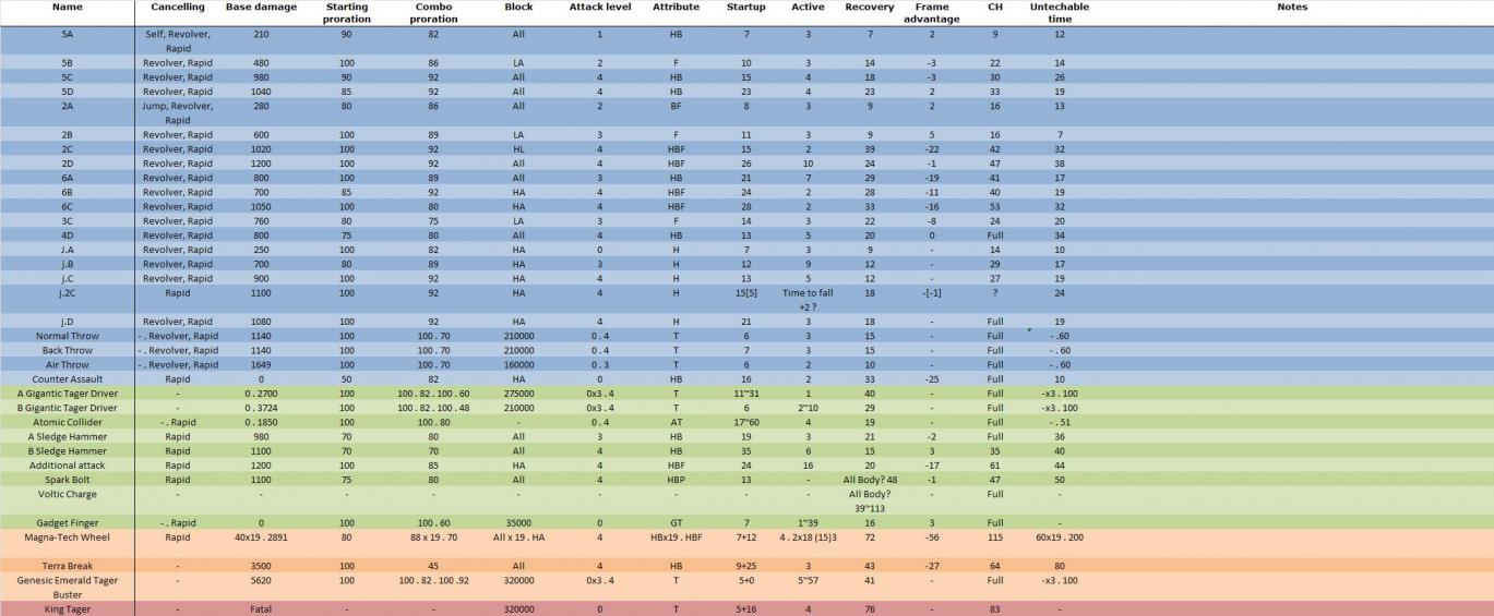Manta Posted May 10, 2010 Posted May 10, 2010 (frame Data) http://www.j1n.org/veteru/blazblue/quashkanye/IMG098-Tager.jpg I don't understand a single symbol of Japanese, however I've pretty much worked out what each coloum means in this table: Name Cancelling (Self cancel, revolver action, Rapid, Jump) Base damage Starting proration Combo proration Acceptable blocking methods (High, low, Air, Air barrier) Attack level Hitbox attributes (Air, Head, Body, Foot or the range of the throws (?)) Startup Frames (variable frames are listed for Tager's charge moves like 360A) Active Frames Recovery Frames Frame advantage on block Counterhit hitstun Untechable time Notes (Invulnerable time, guard breaker propeties, Magnetism length, Magnetism active frames etc etc..) At the bottom of the image there are two more tables. The first describes the magnetism time for the D moves (They're all 6 seconds except for 4D which is 4) and then a table for all of the moves which attract a magnetised opponent. I might get around to tabulating all of this if I get bored. I can only really guess at what the notes say based on the numbers that appear. Interesting to see that 360A actually only has one active frame when you let go of the button. I've attached a preliminary translation of the frae data, I'll add in all the notes when i have more time.