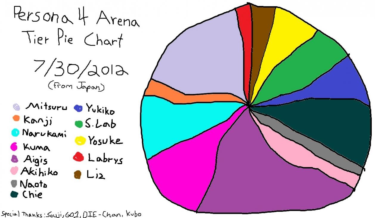 I know you guys have only had the game for a few days, but at least try and be more professional when discussing tiers. S Tier? B Tier? What does this mean? They're just abstract rankings made by netplay scrubs and stream monsters with no fact/science/math behind it. I live in Japan, and I know many Japanese players and have many Japanese friends. Japan is an advanced country (in my opinion, more advanced than America); and here in Japan, we believe that if there is no concrete data backing the tiers, then they are worthless. I might get in trouble with the guys at the arcade, but here is something that we have been working on the past few weeks. As you'll notice, this chart is much more polished and professional than the ones being discussed on this site. If you crunch the numbers, you'll notice that each individual character's proportion on the chart translates DIRECTLY to their CTWP (Chance to Win Percentage) For example, if Aigis(28%) fights against Yosuke(11%), then there is a 28% chance Aigis will win the match, and an 11% chance Yosuke will win. Akihiko vs Liz: 15% chance Akihiko will win, 13% chance Liz will win. Narukami vs Mitsuru: 21% chance Narukami will win, 26% chance Mitsuru will win. Etc. Etc... Compiling the data and making the chart wasn't easy, but we tried to make it simple enough and used many bright colors to ensure the Americans would also be able to understand. Hopefully people on this site will finally realize how pointless theory fighting is and begin looking at the math that goes on behind fighting games. If you have any questions, feel free to ask.