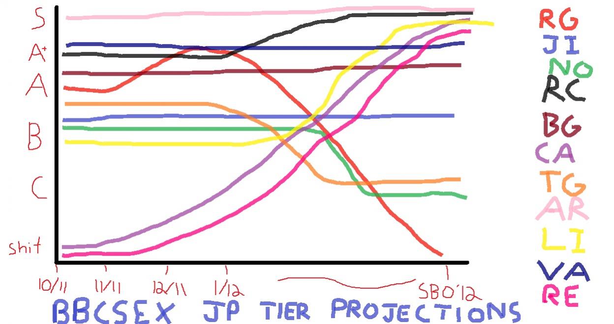 So BBCSEX was officially released today, but most of the top players (me included) have actually been playing it for a little while already. The game is a step up from CS2, but it's not that different so it was pretty easy to see what kind of direction the game will take on a competitive level. This chart is based on discussion with multiple Japanese SBO qualifiers from CS1/CS2 (Mame top8 makoto, Chou/Tsujikawa CS1 champions, Whistler/Nagakura, etc etc), so it's pretty reliable. Unlisted chars are still being discussed.