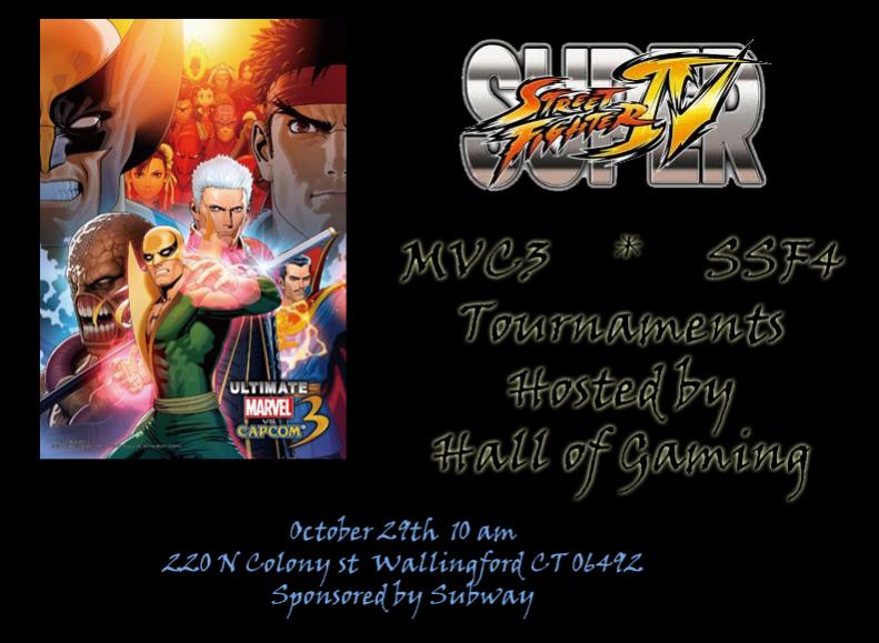 2. October 29 MvC3 and SSF4 Tournament If u Planning to attend please make a comment! Warm ups start HERE! BYOC *Location* Hall of Gaming 220 North Colony Street Wallingford, CT We are in the corner of the plaza behind a Subway. Plenty of parking. Venue Fee $5.00 $5.00 to enter per event *Schedule* 10:00am - Doors open 10:00-11:00 - Sign up for MvC3 12:00 - MvC3 Begins 2:00 pm Sign ups for SSF4 3:00 pm SSF4 Begins Match Format When a match is called, each player will decide which side of the screen they wish to sit on (1P or 2P), as well as which version of the game they wish to play (360 or PS3). If a decision can’t be reached, a coin flip will be used. After sides are decided, teams will be selected in a free-for-all style, and then the first game will begin. At the end of the first game, the loser will have the option to change sides as well as change team, team order and/or assists. The winner, however, has no choice in side and must keep the same team, order and assists that they won with for the next game. For each subsequent game, the same rules apply to the winner and loser of the previous game. At the end of the match, the winner will report the match results to a Hall of Gaming staff member. What version of the game will we be using? We will be using both the X-Box 360 and Playstation 3 versions of Marvel vs. Capcom 3. What will the game settings be? The game will be played with the following settings: Operation Mode: Normal Timer: 99 Damage: Medium Stage: Random Will arcade controllers (fight sticks) be allowed? Yes. You may also share them, but stick owners are by no means obligated to share. Nor will there be any provided to people who don’t own one. Hall of Gaming staff are also not liable for any theft, damage or destruction of personal equipment brought to the tournament. If you bring a fight stick, it is at your own risk. What about macros? No. What happens if each player has a different preference of console? We'll do our best to accommodate this if it happens, but if an amicable decision can't be reached, we'll use a coin flip. Will all characters be available? Yes. Each copy of the game will have its full, on-disc roster unlocked. (Excluding Shuma-Gorath and Jill Valentine) Will Jill Valentine and Shuma-Gorath be available? No. Are there any banned characters? Only Shuma-Gorath and Jill Valentine due to lack of DLC on certain consoles. Can we pause during the middle of a game? No. Doing so will result in a game forfeiture (loss) for whoever paused unless it was a judge or the director.