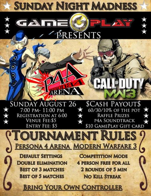 4. When: Sunday August 26th, 2012 Location: 5911 East Spring Street Long Beach, CA 90808 Registration Starts at 6PM Tournament Starts at 7PM Game Line Up Call of Duty Modern Warfare 3 FFA (XBOX 360) Persona 4 Arena (PS3) Entry Fee $5 Venue Fee (One Time Fee) $5 Entry Fee (Per Game) Prize 1st 60% of the pot 2nd 30% of the pot 3rd 10% of the pot Plus 20% BONUS of total pot to the pot Raffle Prizes You will receive a raffle ticket per entry. You can also buy a raffle ticket for $1 per ticket. $10 Gameplay gift card Persona 4 Music Soundtrack More TBA Rules Persona 4 PS3 Version Double elimination Matches will be best 2 out of 3 games Matches will be best 3 out of 5 games for Losers, Winners, and Grand Finals Each game will be best 2 out of 3 rounds Round timer: 99 sec No Unlimited characters Winner cannot change character Loser can change character No game breaking exploits, bugs, or anything that causes the system to crash Players must bring their own controller or joystick Modern Warfare 3 Competition Mode 4 Person Free For All 2 rounds of 5 minutes matches, top 2 highest overall placing of both game advances No Kill streak You will have 5 minutes to configure your classes between each round Stages will be randomly chosen between Dome, Seatown, and Hardhat BRING YOUR OWN CONTROLLER Side Note If they tell you that they only have a 360 arcade stick, tell them we have 2 madcatz TE fight stick for them to use. We have a ps3 to 360 controller converter and MW3 does have a controller config that makes the 360 layout just like the ps3 layout. If they have more questions, they can send a message to facebook.com/2ggaming NOTE: We have 2 TE house stick and PS3 to 360 controller converters Since we are sponsor by NOS, we will be providing free NOS energy drinks and swag!