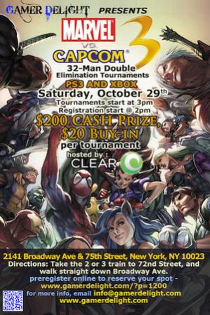 1. GAMER DELIGHT presents.... MARVEL vs. CAPCOM 3 PS3/XBOX 360 TOURNAMENTS SATURDAY OCTOBER 29TH 3:00PM-6:00PM www.gamerdelight.com CLEAR Store 2141 Broadway Ave & 75th Street New York, NY 10023 Come battle it out for a $200 CASH Prize at our Official MARVEL vs. CAPCOM 3 Tournaments on October 29th. It’s 2 Double Elimination, 32-Man Tournaments, and with a buy-in of only $20 for each, you’ll get plenty of bang for your buck! It’s 2 systems, 2 tournaments, 2 ways to win!! The event is going down at the Clear Store in Manhattan, NY located @ 2141 Broadway & 75th Street. Hop on the 2 or 3 train to 72nd Street, and walk down Broadway to 75th Street and the store will be right there! The Tournaments start at 3pm, get there at 2pm to register. Spectators are always welcome, so if you want to show off to your friends, be sure to invite them along! MARVEL vs. CAPCOM 3 Tournament RULES are as follows - 32 Man Double Elimination Tournaments Systems: PS3 & XBOX360 Standard controllers available, feel free to BYOC (fight sticks allowed) Time: 99 Damage: Standard Best of 3 Matches, Final Round – Best of 5 Matches Winner keeps Team (Characters, Assists and Order must be exactly the same) Pre-register online NOW to guarantee yourself a spot before there's no space left! Like us on facebook for more local NY tournament updates - http://www.facebook.com/TheOfficialGD for more info, contact info@gamerdelight.com www.gamerdelight.com