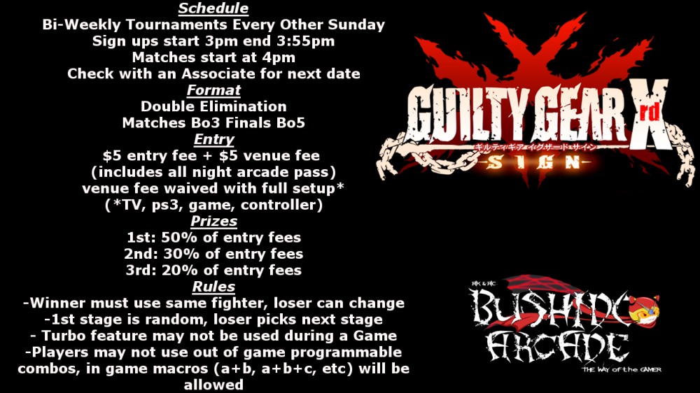 Heads up, there's a mini-convention going on Saturday (March 21) at Our Lady of the Lake University called Mizuumi-con. It's a one-day anime convention that also has a game room, so if any of you are interested in that, you can check it out and see if they have anything like BB, GG, or any of the other ArcSys/anime games there.