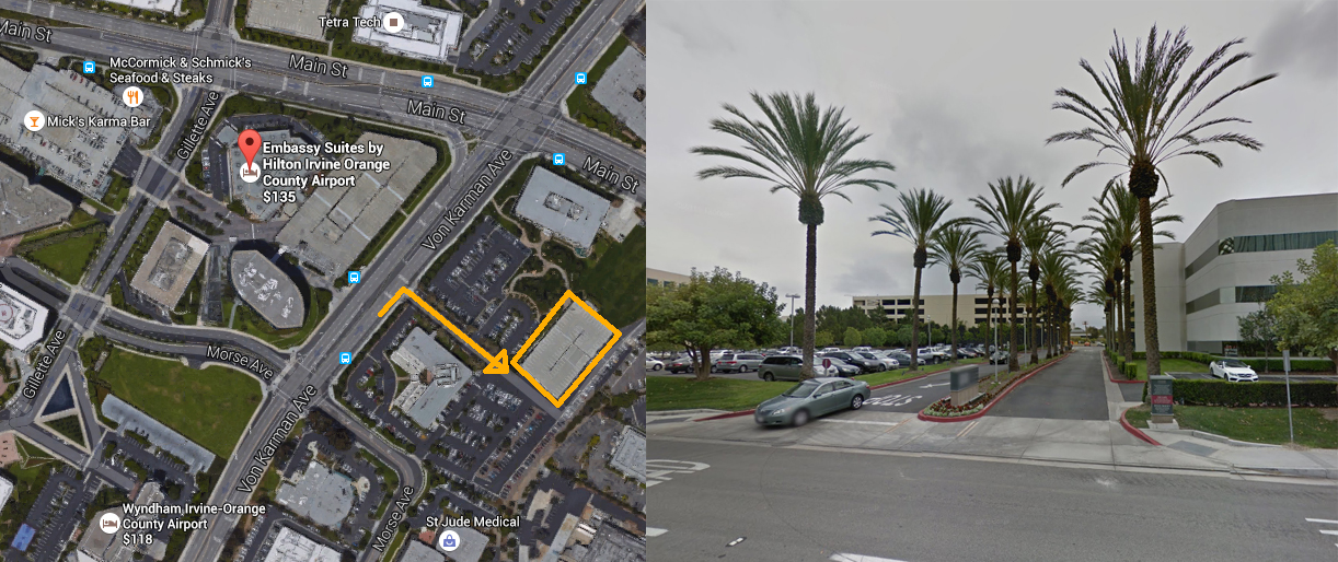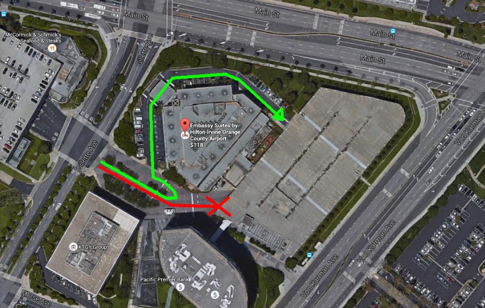 Alright here are a couple diagrams for how parking will hopefully work. When entering in by making a left on Gillette Ave, do not go straight into the parking structure as the hotel does not validate parking in that area normally. Make a U-turn and then a right into the Embassy Suites parking lot and then continue along the path until reaching the lower entrance. The tickets from this lot can be validated by the one who booked the hotel room though this lot is small and fills up fast. I am unsure about how lenient the hotel will be with giving out their validations if the number of cars being asked for goes over a certain point, but if the lower structure becomes full they have allowed validated parking in the upper levels. If for some reason you are not able to get validation then it'll probably cost 15 dollars here or at the structure on the other side of Gillette. For anyone planning on staying multiple nights I highly suggest parking here. If things do actually overflow and the ones who do not get validation do not want to pay, there is a large structure right across Von Karman Ave that does not have a pay station at the front or permit requirement. I have parked here before when going to visit someone at St Jude Medical Center for the day since the surrounding parking areas are usually packed and nothing bad happened. I have not, however, left my car in the structure overnight so do so at your own risk.