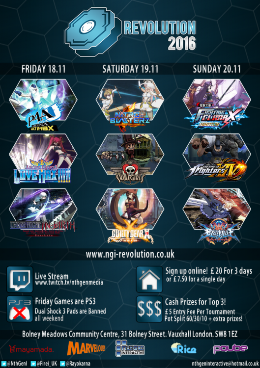 Nth Gen Interactive proudly presents Revolution 2016. This is our third time holding our flagship event, dedicated completely to Anime Fighters! An all-star cast of the latest Anime Fighting games all in their newest iteration for people all around Europe (and beyond) to duke it out to see who is the best . This tournament is going to be a celebration and a showcase of the anime fighting game community as a whole to bring out the best in competition, skill and adaptability. Games List FRIDAY Arcana Heart 3: Love Max [ Playstation 3 ] Persona 4 Arena Ultimax Ultra Suplex Hold [ Playstation 3 ] Under Night In-Birth Exe:Late [ Playstation 3 ] SATURDAY Skullgirls: Second Encore [ Playstation 4 ] Nitroplus Blasterz: A Heroines Duel [ Playstation 4 ] Guilty Gear Xrd -REVELATOR- [ Playstation 4 ] SUNDAY Dengeki Bunko Fighting Climax Ignition [ Playstation 4 ] King of Fighters XIV [ Playstation 4 ] Blazblue: Central Fiction [ Playstation 4 ] Event Information Location: Bolney Meadow Community Center, 31 Bolney Street, Vauxhall, London, SW8 1EZ, England UK Date: November 18th, 19th and 20th 2016 Times: Friday: 11am – 10pm Saturday: 10am – 10pm Sunday: 10am – 9pm Nearest Tube Station: Vauxhall (Victoria Line/National Rail, Zone 2) and Stockwell (Victoria Line/Northern Line Zone 2) There will be early sign ups and entry available online with a payment system. Discount prices for venue fee if you book in advance, If you plan to play in any tournaments, it is advised you register and pay in advance to book your spot in the tournament. If you do not, you will miss out. Entry Cost: £20 Pre-Sign Up Weekend Entry (All 3 Days) £7.50 Pre-Sign Up Single Day Entry £30 On the Door Weekend Entry (All 3 Days) £12 On the Door Single Day Entry £5 Per Tournament Online Transactions are done via Paypal on the [Sign Up page]. Pre-Registration ends on the 10th November The entry fee from each tournament will go into their respective pot. The money will be split as follows between the winners: 1st Place – 60% 2nd Place – 30% 3rd Place – 10% Rules Format: Double Elimination Each set will be First to 2 Games (Best out of 3). Grand Finals will be First to 3 (best out of 5). Skullgirls is an exception and will be run First to 3 Games throughout the entire tournament. For more information on the rules of the tournament. Check out the rules page [Here] The stream will be at: www.twitch.tv/nthgenmedia There are a few game specific rules BBCF - No Unlimited Characters are allowed AH3LM -In addition to normal switching rules, both players may change Arcana regardless of win or lose SG 2nd Encore - Best of 5 (First to 3) all throughout the tournament. DFCI - In addition to normal switching rules, both players may change Assists regardless of win or lose Additional Rules If there is a pause or controller disconnect while the game is active, then the offending player forfeits that round. Notify when you are going for a button check so there is no confusion. Buttons checks MUST be performed before the match starts and is the responsibility of the player. Any players caught colluding will be BANNED from the tournament without refund. NO EXCEPTIONS. Chronos converters are banned PS4 wireless pads are allowed. Any input lag caused by bluetooth inteference will not be NGI’s liability. PS3 wireless pads are banned You must be aged 16 or above No alcohol/drugs/illegal substances, any found will mean ejection from the venue and possible banning of future events. No fighting at the venue, any fighting is a bannable offense, if there is a problem please contact a member of staff first. Any weaponry brought to the venue will result in immediate calls to the police. Any controllers and sticks are your own responsibility; we will not look after any at any time. Do not touch any of the consoles unless you are plugging in your stick or controller. Please make sure you have your wrist band at all times. Staff will periodically check if you have your wristband with you For venue entry, please print off your PayPal receipt and a symbol of identification (Driver’s Licence, Passport, EU National Identity Card) to get your wristband. If you have any questions, you can find us on twitter @nthgenI @rayokarna @firei_uk @frostybolty For more information and signup, here is the website - www.ngi-revolution.co.uk