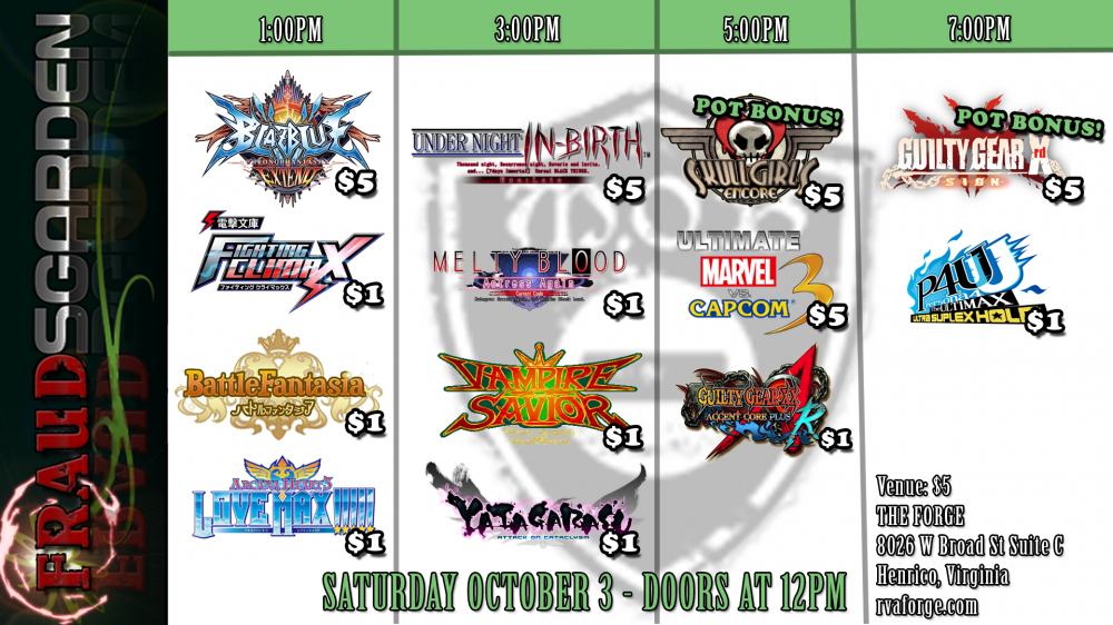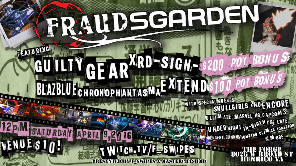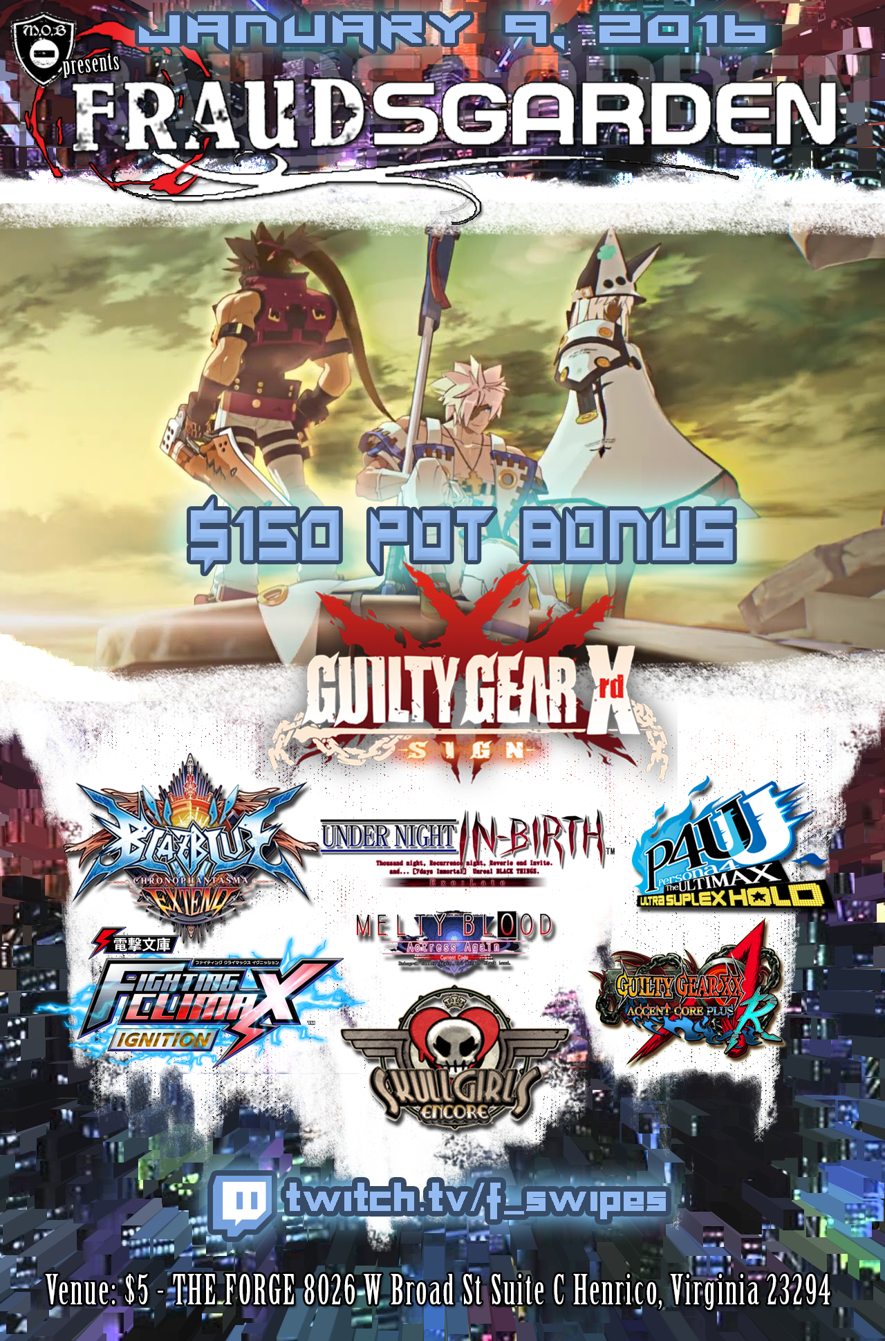 MOB presentsFRAUDSGARDEN (。+・`ω・´) < !!! An All Anime Game EventJanuary 9, 2016Flyer: http://imgur.com/ZMyzc9t THE FORGE8026 W Broad St, Ste CHenrico, VirginiaVenue: $5 Guilty Gear Xrd -Sign- ($150 Pot Bonus!!!) - $10 - PS3