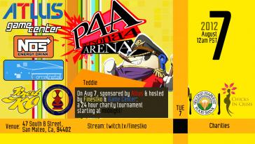 6. (Art provided in flyer 3 & 4 were specifically made for this Charity Event by Paxiti. Thank you for the help! Date: 8/7/12 Time: 12AM PST (8/7) - 12AM PST (8/8) Venue: 47 South B Street, San Mateo, CA, 94402 Stream: www.twitch.tv/finestko Facebook Events Page: www.tinyurl.com/P4UCharity Charities: Second Harvest Food Bank and Chicks in Crisis. Venue Fee $8 ($4 to the venue, $4 to the Charities). Schedule (PST): Descriptions of SIDE EVENTS below the schedule. 2AM *Waifu Wars 4AM *NOS Powerup 6AM (Single) Tournament 9AM Q/A with Viewers Noon (Team) Tournament 2PM *Cosplayer time 3PM (Single) Tournament 5PM *Second Harvest Food Bank 6PM (Team) Tournament 9PM (Single) Tournaments 24Hrs *All Out Attack/Charity MMs *** Charity MM Exhibitions will be held when there are no events or matches happening on the stream. Below are examples of certain Charity MM sets. – $5 – Best 2/3 (Matches) - $10 - Best 3/5 (Matches) - $50 First to 7 (Matches) - $100 First to 10 (Matches) Side Event Description: Waifu Wars (2AM): Cabinets are assigned numbers and a specific Persona 4 character figurine. The player with the highest win streak on each cabinet receives the Persona 4 figurine that was assigned to the respective cabinet. Nos Powerup (4AM): This side event hopes to highlight players who are willing to do long sets against another individual for practice or pride. Players may signup during or prior to the side event to participate. Two players will play in a first to 3 wins or first to 5 (match) wins. The loser will be required to POWERUP (to defeat his opponent) and drink a wagered amount of NOS (no bigger than a shot) after each match loss. The victor will be awarded one point, which will be added towards winning a copy of Persona 4 Arena (Ps3)! Q/A with Viewers (9AM): Stream viewers can ask questions by tweeting with #P4UCharity. Questions will be answered by Norcal top players! Cosplayer Time (2PM): Cosplayers who attend the event can commentate and speak on the stream! Get familiar with the FGC! Announcement from Second Harvest Food Bank (5PM): An announcement will be made to help support the charity and those in need. All Out Attack/ Charity MM's (All Day): 2$ eight-player tournaments & charity MMs are held throughout the 24 hour event. Participants receive a consolation charity raffle ticket and 1st & 2nd of the 8- player tournament receive 5 and 3 charity raffle tickets respectively. To start an 8-man bracket, request a paper bracket from an event organizer and pay the $2 entry fee. These tournaments will be self-run by the participants and checked off my events organizers. Players who have finished their matches must both initialize their names to show the winner and loser. This continues until first and second place have been determined. Charity MMs are exhibitions/pride matches with a monetary wager. Players will be featured on the stream and loser donates to a charity of their choice. Raffle Details: - All raffles and donations will go towards both charities equally - Contact Info (Required Online or Offline) – International Shipping Pays Own – Raffle starts at the End of the Event – 1$ for 1 Ticket, 10$ for 13 Tickets. $20 – 30 Tickets Raffle Prizes: **Disclaimer. If you win a copy of Persona 4 Arena (PS3), you will need a North American PS3. The game is region locked. **Raffle begins at the END of the Event. x 6 Copies of Persona 4 Arena x 2 Persona 4 Figurines x 4 PS3 FightStick Pros. x 6 Broken Tier Shirts x 4 Tritton AX Pro Gaming Headsets x 4 FightStick Carrier Bags. Description: Persona 4 Arena is the brand new hit fighting game from renowned company Arc System Works, known for such fighting game franchises as Guilty Gear and BlazBlue. In celebration of the console release of Persona 4 Arena, FinestKO presents a 24 hour charity stream with support of Atlus, MadCatz, NOS and organized by Game Center, NorCal Install, and Dromstruction! All proceeds will go to our wonderful charities, Second Harvest Food Bank and Chicks in Crisis! Tune in to see live footage of tournaments, contests, and more fun events for Persona 4 Arena! Tournament Rules: Singles: $2 Entry Fee: All entry fees go towards charity. Double Elimination Best 2/3 rounds. Best 2/3 matches with the exception of Losers, Winners, and Grand Finals, which will be 2/3 rounds and 3/5 matches. Teams (2 on 2): $4 (Per Team) Entry Fee: All entry fees go towards charity. Double Elimination. Best 2/3 rounds. Best of 1 match with the exception of Losers, Winners, and Grand Finals, which will be 2/3 rounds and 2/3 matches. Winners of Singles and Team tournaments will accumulate points, which will be tallied up at the end of the night. Based on the highest number of points, players will be given prizes (prizes to be determined). Tournament Points Go Towards Prizes: Points will be tallied up, and at the end of the event, 1st, 2nd, and 3rd in points will receive copies of Persona 4 Arena (ps3). Point Distribution: *Teams (2 on 2) Split the points between each other. *Points will be rounded up in case of a decimal place. N= Number of Entrants .7 x n points = 1st .2 x n points = 2nd .1 x n points = 3rd 1 point for participating.